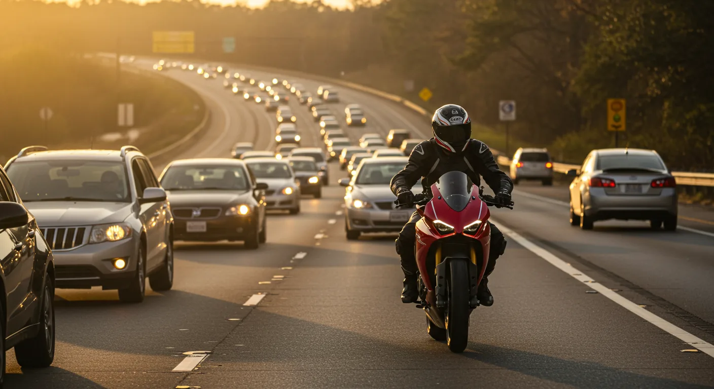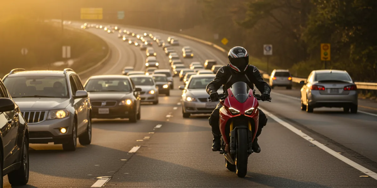 Lane splitting is riding a motorcycle between lanes of slower-moving or stopped traffic. The new law specifies that while it is generally discouraged, it will not automatically be considered negligence in an accident.